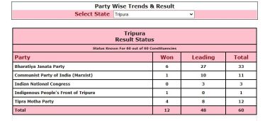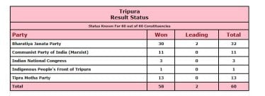 The Bharatiya Janata Party has taken a comfortable lead with 33 seats in the 60-member Assembly, and looks poised to get a second term in the state. The CPI-M party is leading in nine seats, INC leads in five seats, and new party TIPRA Motha party is leading in 11 seats, as per the ECI trends on 11:45 AM.