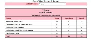 Trends by the Election Commission of India show that the Manik Saha-led BJP is leading in 28 of the 60 seats, while CPI-Marxist is leading in 13 seats, and TIPRA Motha party is leading in 13 seats.