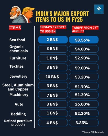 The United States has imposed a 50% tariff on Indian goods with effect from August 27. The tariff hit, highest globally, is expected to impact exports worth over $48 billion.