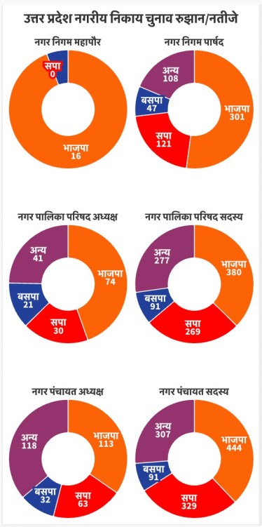 BJP has won Ayodhya, Ghaziabad and Jhansi Municipal Corporations. The party is also leading in 13 other corporations for mayor posts. BSP is leading in Agra