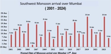 The Southwest Monsoon has advanced to Mumbai today, 26th May 2025, against the normal date of advancement, 11th June. Thus, the monsoon has arrived in Mumbai 16 days earlier than usual.