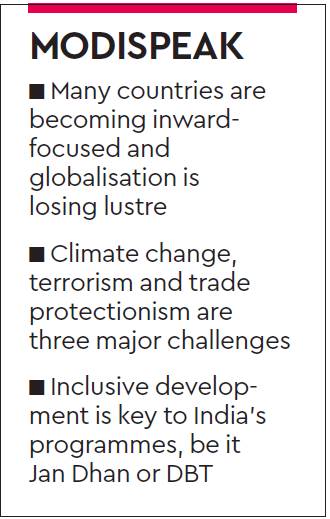 MAKING OUT a case for eliminating rifts and differences to build a new world order, Prime Minister Narendra Modi on Tuesday flagged the rising threat of protectionism with a new layer of tariff and non-tariff barriers being erected and countries increasingly focusing inwards. Speaking at the plenary of World Economic Forum in his first visit to Davos, and the first by an Indian Prime Minister in 20 years, Modi also pitched India as an investment destination, emphasising on efforts to improve ease of doing business. “We have made it so easier to invest in India, manufacture in India and work in India. We have decided to uproot licence and permit Raj. We are replacing red tape with red carpet,” he said. In the global context, Modi said that bilateral negotiations have virtually come to a standstill because of the new trade barriers. “We have to accept that globalisation is losing lustre with the intention being to reverse the natural flow of globalisation, and forces of protectionism are raising their heads again,” he said in a keynote address on the opening day of the WEF.