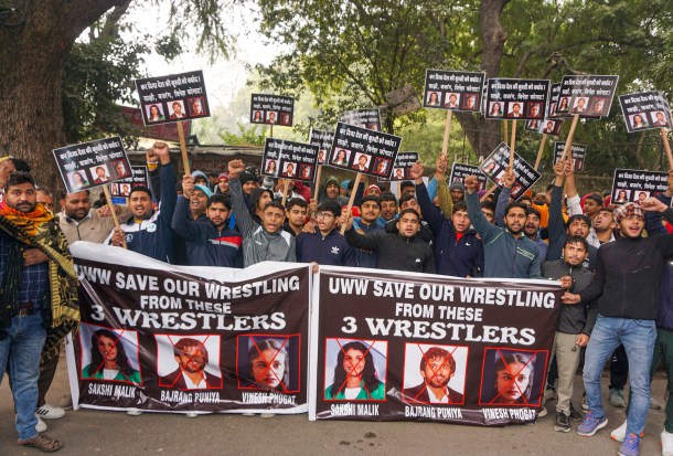 Around 300 junior wrestlers from different parts of Uttar Pradesh, Haryana and Delhi shouted slogans against the three. Reportedly, the police were caught unawares. Some protesters carried banners that read, ‘UWW (United World Wrestling) save our wrestling from these 3 wrestlers’. The protesters also defaced the placards bearing images of the three wrestlers before trampling them.