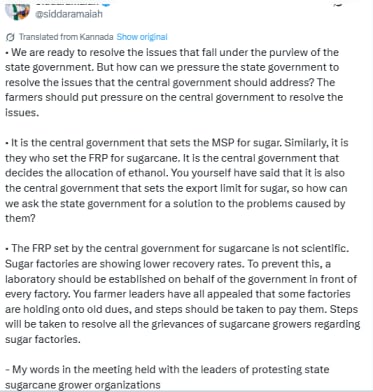 ಸಿದ್ದರಾಮಯ್ಯನವರು ಕಬ್ಬು ಬೆಳೆಗಾರರ ಸಮಸ್ಯೆಗಳನ್ನು ಆಲಿಸುವಲ್ಲಿ ವಿಫಲರಾಗಿ, ಕೇಂದ್ರ ಸರ್ಕಾರದ ಮೇಲೆ ಬೆರಳು ತೋರಿ… pic.twitter.com/pWdem1CyCP