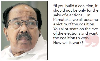 If you build a coalition, it should not be only for the sake of elections. It has to be done methodologically and strategically. If the coalition ethos is not spread across the rank and file of the parties, it doesn’t work. In Karnataka, we all became a victim of the coalition. You allot seats on the eve of the elections and want the coalition to work… How will it work? The coalition that is practised in Kerala is ideal. As general secretary, I was also in charge of Kerala. There the coalition works right from the mandal level to the block level, Assembly level, right up to the Lok Sabha level. This is the coalition that is needed. The Congress has to take up this leadership and that was not done… I must tell you that all of us lost because of the coalition.