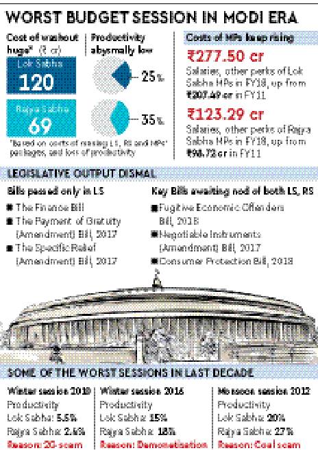 With the 22 sittings having witnessed only 25% productivity in the Lok Sabha and 35% in the Rajya Sabha so far, the current session will rank among the worst in nearly a decade, eclipsed only by three sessions that were washed out due to 2G scam, demonetisation and Coalgate.