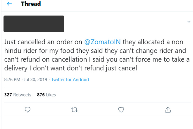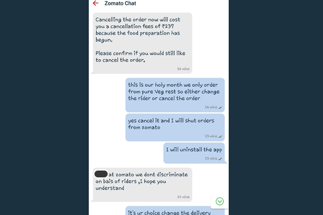 The user stated that he had a problem with his order being delivered by a “non-Hindu rider”. He also demanded that the company cancel his order, but claimed that he was being levied a cancellation charge.