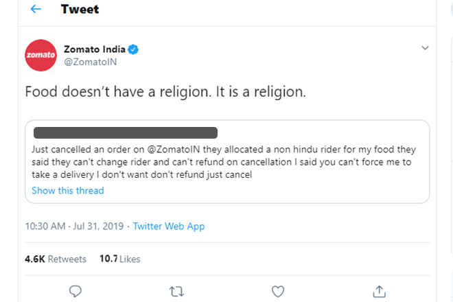 Food delivery app Zomato is winning accolades for not entertaining a customer who tried to have an order cancelled as the delivery rider belonged to a different religion. A user on Tuesday evening posted on Twitter, “Just cancelled an order on @ZomatoIN they allocated a non hindu rider for my food they said they can’t change rider and can’t refund on cancellation I said you can’t force me to take a delivery I don’t want don’t refund just cancel.”
