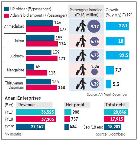 Adani Enterprises, the flagship entity of the group, on Monday bagged the rights to operate, manage and develop airports at Ahmedabad, Jaipur, Lucknow, Thiruvananthapuram and Mangalore by offering the highest per-passenger fee (PPF). PPF is paid by the developer to state-owned AAI for every domestic and international passenger handled at the airport.