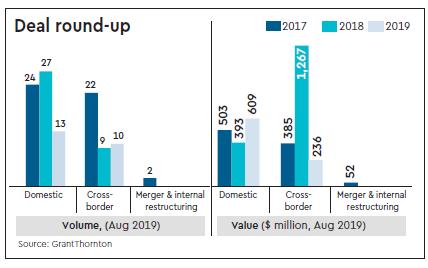 With the ongoing global uncertainties impacting business confidence and dampening deal making, August recorded only 23 deals worth $845 million, which is a 49% decline in deal values over the same month last year, said the dealtracker report by Grant Thornton.
