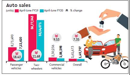 Auto sales across categories fell the sharpest (-12% year-on-year) since 2008-09 in the April-June quarter, impacted by production cuts and shutdown of plants by major automakers to manage inventory, which is higher than normal due to poor demand.