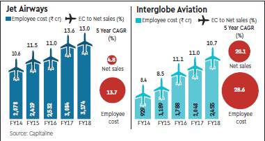 There is a reason why the Jet management is worried about the employee costs and why Jet wants to reduce its manpower spend. Jet Airways , the second largest airline by market share (around 14%), has not posted a profit for the past 11 years, barring FY16 and FY17, but its employee costs have been on the rise. For example in FY18, the airline incurred Rs 3174.22 crore in employee costs, up from the Rs 3084.21 of FY17, which in itself was a big jump from the Rs 2,532.33 of FY16. In FY17 alone, employee costs shot up by a big margin of 21.79%.