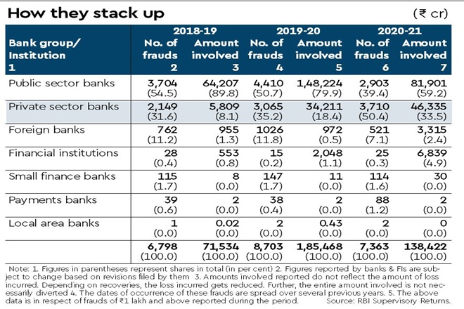 If an account is declared as fraud, banks need to set aside 100% of the outstanding loans as provisions, either in one go or spread over four quarters, as per RBI norms. According to data shared by the central bank, 59.2% of the total value of frauds were reported by public sector banks, followed by private sector banks at 33.5% during 2020-21. Last year, 80% of the total value of frauds were reported by public sector banks and 18.4% by the private sector banks.
