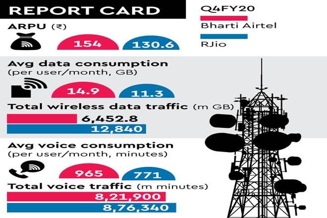Since all the three operators had increased tariffs by up to 50% in December 2019, the full impact of it was seen during the January-March quarter. Bharti’s jump being much higher that Jio’s signals that Bharti is adding higher Arpu generating 4G subscribers while Jio’s subscriber addition, though higher than Bharti’s is mostly for low-end JioPhone users, thus not translating into higher Arpu.