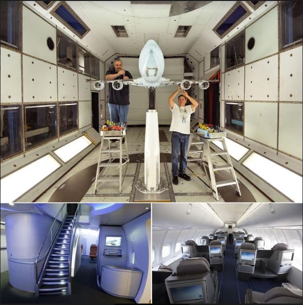 Boeing’s latest version of the jet, the 747-8, was given an engine overhaul and new wings, at the urging of Lufthansa and Sutter, who despite retirement remained a Boeing adviser into his 90s. The upgrade proved costly as design changes and an engineering shortage caused by the tardy Dreamliner left the 747 years behind schedule. Top, wind-tunnel testing in 2006. Bottom left, a stairway to the upper cabin of the Boeing 747-8 shown in a mock-up of the interior at the Boeing Customer Experience Center in Renton, Washington in 2011. Bottom right, Lufthansa’s 747-8 business class cabin in 2014.