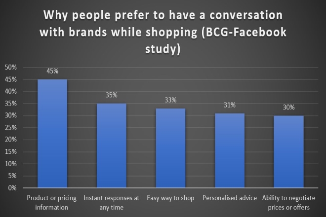 According to BCG-Facebook global study, with 87 per cent of the world’s smartphone population messaging, people prefer to have a conversation with brands while shopping.