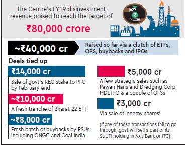 In the Interim Budget speech, finance minister Piyush Goyal has stated that the disinvestment target for the current fiscal would be achieved. Of the receipts so far, Rs 25,325 crore or 63% came through exchange-traded funds (ETFs). At least Rs 14,000 crore is assured from the proposed Power Finance Corporation’s purchase of the Centre’s 52.63% stake in Rural Electrification Corporation for which the Cabinet has already accorded in-principle nod.