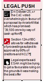 Legal experts said the promoters of Essar Steel were looking to convince the tribunal its proposal to pay Rs 54,389 crore, as a full settlement, should be taken cognizance of by the committee of creditors (CoC). On October 25, the CoC voted overwhelmingly in favour of a proposal by ArcelorMittal which has promised Rs 39,500 crore by way of cash upfront.