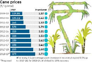 A premium of Rs 2.75 per quintal has been proposed to be paid to farmers in 2018-19 (over and above the FRP of `275) for every 0.1 percentage point increase in recovery beyond 10%. In 2017-18, every 0.1 percentage point increase in recovery above 9.5% fetched a premium of Rs 2.68.