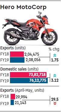 In a meeting with analysts last month, Hero MotoCorp’s management said increase in shipment of volumes will be led by growing in key markets including Colombia, Argentina, Africa, Sri Lanka and Bangladesh and launch of new products in 35-40 markets that it entered over the past 3-5 years. “Aspiration of 10% volumes from exports will take at least 3-5 years,” according to analysts at Jefferies. Two-wheeler demand in the domestic market remained lacklustre for the seventh consecutive month in May, dragged down by steep decline reported by companies, including Hero MotoCorp and Honda Motorcycle. As manufacturers did not adjust production during the initial months, inventory piled up at dealers, going up to as high as 90 days. Consequently, companies had to cut production in the January-March period but due to subdued demand, inventory at dealers continues to remain higher than normal.
