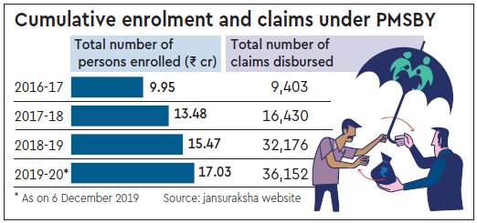 Under the said scheme, the risk coverage available is Rs. 2 lakh for accidental death or permanent total disability and Rs. 1 lakh for permanent partial disability. According to the data from the jansuraskha.gov.in, 17.03 crore enrolments have been done under the PMSBY, while total number of claims disbursed stood at 36,152 as on December 6, 2019. Som the premium received by the insurers would be at Rs. 204 crore, while claims paid by them stands at around Rs. 723 crore.