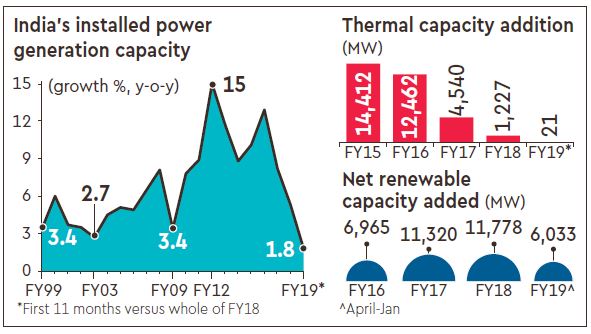 In the thermal power sector, the capacity added in the first 11 months of this fiscal has been a minuscule 21 MW, a sharp fall from the 1,227 MW in the same period in FY18. Given that no major unit is scheduled to be commissioned in March, clearly the annual capacity increase this year would be one of the lowest in history.