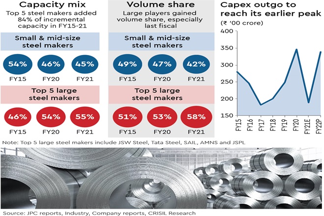 Large steel makers took huge strides in terms of their performance in the last fiscal, increasing their market share by 500 basis points (bps) on-year to 58% despite their share of industry capacity remaining unchanged.