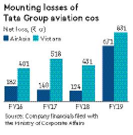 Losses are mounting at the airline firms of the Tata Group – AirAsia India and Vistara. While Vistara’s losses in financial year 2018-19 nearly doubled to Rs 830 crore compared to the previous year, AirAsia’s losses quadrupled to over `670 crore in the same period. Tata Sons holds 51% stake in both airlines. Both have incurred losses through the past four financial years.