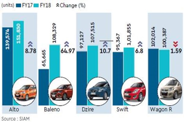 After a couple of years, not only has Baleno managed to trump its competitors, such as Hyundai Elite i20 and Honda Jazz, it is one of the largest-selling hatchbacks in the domestic market despite being priced above the regular products in the segment. As a result, the realisation per unit during the second quarter the current fiscal also improved by 3.6% y-o-y to `4,42,300. “We expect MSIL’s market share to maintain the momentum led by robust volumes of Baleno, Brezza and the new Dzire, which still continue to enjoy healthy waiting periods,” said analysts of Motilal Oswal in a research note on the company.