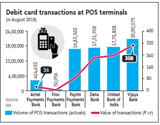 In August, the three payments banks — the first to begin operations — recorded a combined 2.15 million debit card transactions. This is higher than the individual tallies of Vijaya Bank (2.09 million), United Bank of India (1.77 million) and Dena Bank (1.73 million). With a monthly volume of 1.68 million debit card-based POS transactions, Paytm Payments Bank has nearly caught up with the smallest PSBs in the system within less than a year of its launch.