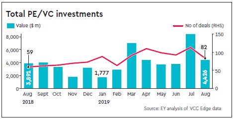 Investments in infrastructure and real estate sectors accounted for 35% of the total PE/VC investments in August 2019 compared to 23% in August 2018.