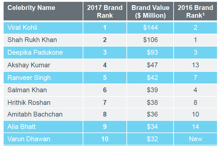 Dominating the Bollywood box office coffers for over three decades now, Salman Khan can be counted as the only star whose brand image has seen a complete turnaround. From a brash, spoilt, rugged ‘bad boy’, he has worked hard over the years to change perceptions. From playing those goody-two-shoes characters in movies to generating compassion through his clothing line Being Human, Khan transformed himself to become a popular brand endorser of the 2000s. Khan recently topped Forbes India’s Celebrity 100 list for the second consecutive year in 2017 with earnings of `232.83 crore backed by endorsements of several brands. The 52-year old actor’s earnings constituted 8.67% of the total earnings — Rs 2,683 crore — of the top 100 celebrities for the year. “With more than 75 million followers across major social media platforms, Salman ranked number one on our social media popularity index,” states Varun Gupta, MD and region leader for India, Japan and Southeast Asia at Duff & Phelps. “He has become the most bankable choice for lesser-known brands who want to gain nationwide visibility in a short span of time.”