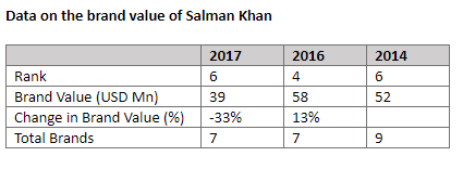 However, as per Duff & Phelps, the brand value of Salman Khan declined by approximately 33% in 2017 primarily due to a downward revision of the estimated endorsement fees. According to Forbes, his earnings have dipped currently, from a high of Rs 270.33 crore in 2016. Once a star endorser for brands like Thums Up, Hero Honda bikes, etc, his endorsement kitty currently comprises more mass-y brands.