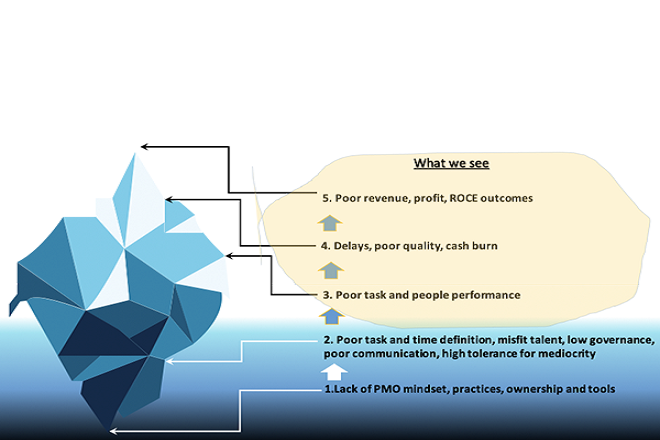 At the top of the iceberg in water, is poor financials, followed by time, quality, and money-related issues, driven by poor task and people performance. The owners see, feel, hear and experience these issues, recurringly. More often than not, what is ignored is the poor task and time definition, misfit talent, low governance, poor communication. Unfortunately, I have seen many MSMEs tolerate mediocrity under the veil of resource crunch. This is what constitutes the ignored at the bottom of the iceberg, in water.