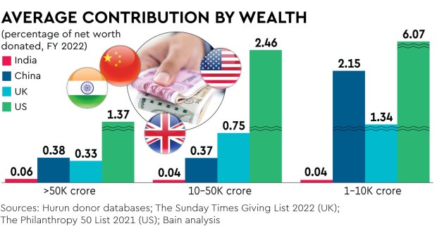 Indian ultra-high net worth individuals (UHNIs) continue to donate substantially less compared with their peers in the US, the UK and China. As per the latest India Philanthropy Report 2023 released by Dasra, a strategic philanthropic organisation, and management consulting firm Bain & Company, contributions of UHNIs (people with net worth above Rs 1,000 crore) have been volatile with donations (excluding contributions by Azim Premji) dropping by 5% in FY22, despite a 9% increase in their cumulative wealth.