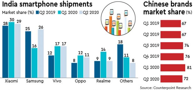 The Covid-19 pandemic and the lockdown, followed by anti-China sentiments in India on account of the border dispute seems to have severely dented the dominance of Chinese brands in the domestic market with their total market share falling sharply form an all-time high of 81% to 72% during the recently concluded April-June quarter of current calendar year.