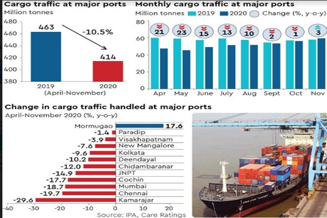 After eight months of contraction, cargo traffic at the major ports grew by 3% y-o-y in November 2020. For the April-November period, the traffic has fallen by 10.5% y-o-y — only Mormugao port has seen a higher volume of cargo in the current financial year than a year ago.