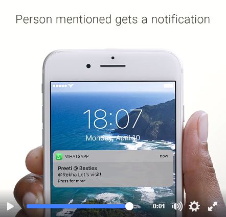 There are hardly any smartphones that don’t have WhatsApp. The real-time messaging app has more or less become a companion of every smartphone. And users on their smartphones are nowadays connected with many groups. And, groups have many people in them. So, what if you want to tag or mention someone – a particular person in the group? How do you do it? And, do you know how it goes and reflects on the phone of the recipient? Here are steps which explain how to tag or mention someone on WhatsApp group and what happens when you do it. These steps were shared by means of a video posted on WhatsApp’s official Facebook page. Basically, when you mention someone in a group, a notification will be sent to that person. Here is how the entire process starts and ends:-