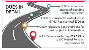 According to sources, ITNL, the road development subsidiary of IL&FS, has claimed an amount of `700 crore for a road project in Maharashtra. A senior NHAI official said the settlement amount awarded by its conciliation committee is usually slightly lower than what contractors claim. “I can’t say what the exact settlement amount will be but it is in advanced stages of being decided,” the official said.