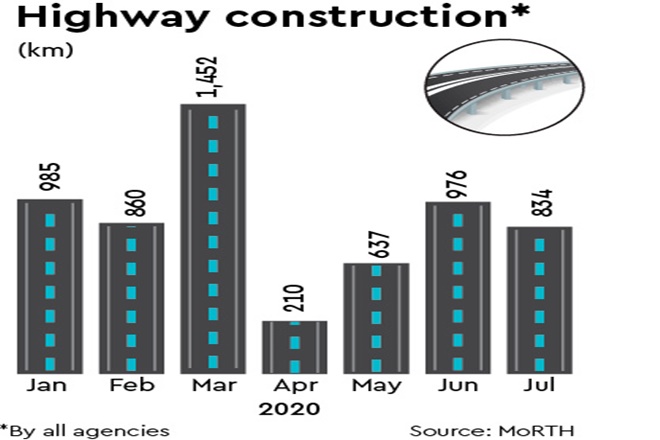 Government sources said of the total highway constructed in April-July of the current fiscal, the ministry of road transport and highways (MoRTH) has done 1,883 km; while its two other implementing agencies — National Highways Authority of India, National Highways and Infrastructure Development Corporation (NHIDCL) — have constructed 598 km and 176 km, respectively.