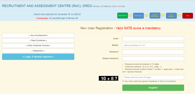 DRDO Recruitment 2018: The Recruitment and Assessment Centre (RAC) of Defence Research and Development Organisation (DRDO) has announced fresh vacancies at drdo.gov.in and rac.gov.in. The recruitment drive is open for engineering graduates to Scientist ‘B’ post. RAC released the detailed advertisement for the post on May 11, 2018, on its official website. It was mentioned the direct recruitment for Scientist ‘B’ in DRDO has now been opened for which the last date is June 1, 2018, till 5 pm.