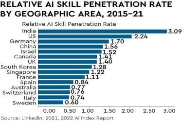 Despite this, the country was ranked at the top in terms of talent concentration and relative AI skill penetration—leading the world in terms of relative skill penetration by gender, with women exhibiting a higher rate than men in the country—in the Stanford University’s Institute for Human-centred Artificial Intelligence’s 2022 Artificial Intelligence Index.