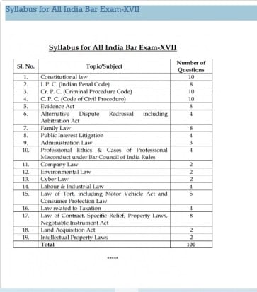 According to the official notice, there is no new change in the syllabus. No new topics have been added and no subject wise weightage has been revised in the syllabus. All the topics including the topic wise distribution of questions in AIBE 17 are unchanged.