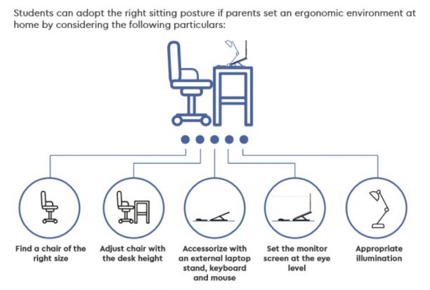 To begin with, parents need to explain the 90-90-90 rule to children. The back and the thighs should form a 90-degree angle while sitting; knees should also be at a 90-degree angle, and the feet and the ankle should be at a 90-degree angle as well. Parents should invest in an ergonomic desk, an adjustable chair of the right size, laptop stands that can be adjusted to make sure they are at the right height, a separate keyboard, and a mouse. At the same time, the study area should be properly illuminated to reduce the strain on the children’s eyes.