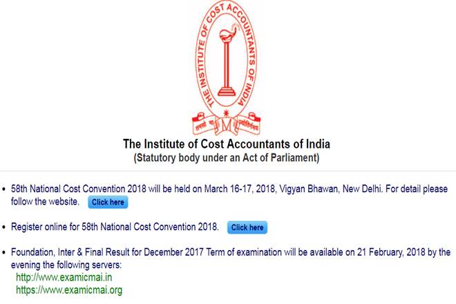 ICAI results Dec 2017: Institute of Cost Accountants of India (ICAI), which is also known as Institute of Cost and Works Accountants (ICWAI) has announced the scores for the ICWAI foundation, intermediate and final certified management accounting (CMA) exams 2017 on the official website icmai.in anytime now. As per the notice on the official website the Foundation, Inter and Final Result for December 2017 Term of the examination will be available on 21 February, 2018 by the evening on Wednesday. The servers that will be displaying the results are examicmai.in and examicmai.org. The scores of the examination that was conducted in December last year will be published in the evening. However, no fixed timing has been announced yet. Applicants who had appeared for the exam and were eagerly waiting for the result are advised to keep a track on the website after 4 pm. The candidates can also visit the two portals that have been set up for candidates to access the results.