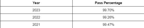 In 2023, the pass percentage was at 99.70%, while in 2022 it was 99.26%. The year 2021 also saw the pass percentage above 99 at 99.47%.