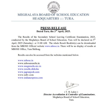 Meghalaya Board SSLC Result 2025 will be out on the official website mbose.in in about 30 minutes at 11 am.