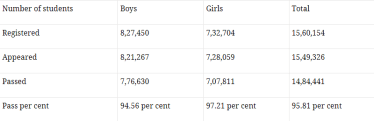 In terms of gender, female students have surpassed their male counterparts. The pass percentage of girls is 2.56 percent higher than that of boys.