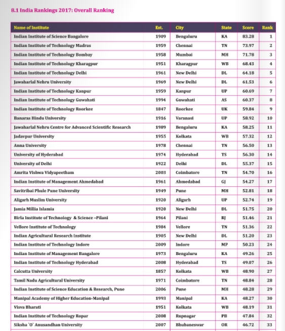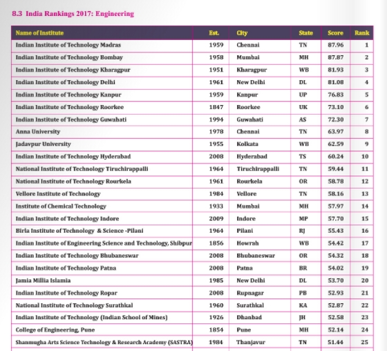 Here is the list of top engineering colleges as per NIRF rankings 2017: