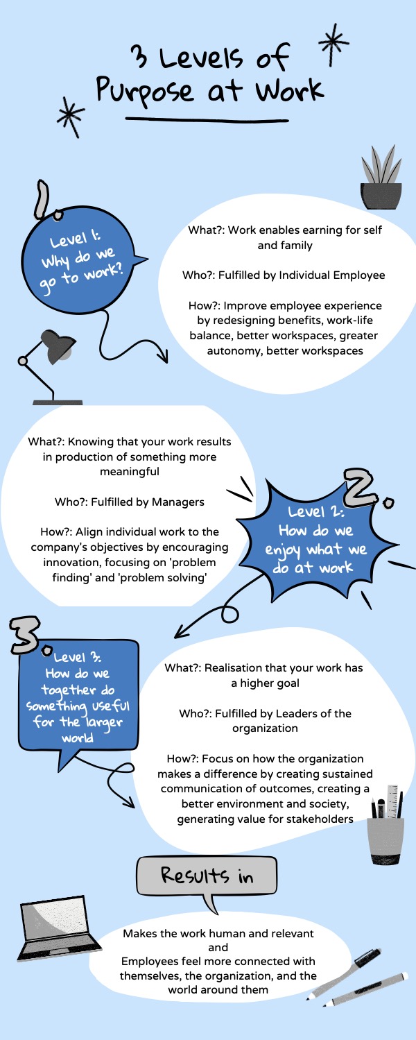 All of us have experienced moments of joy at work where we feel more connected with ourselves, our organisation, and the world around us. This is when all three levels come together to make our work human and relevant. Let’s look at how to drive the three levels of purpose in an organisation.